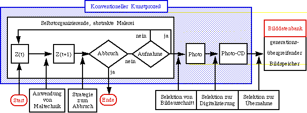 | Konservierung von Zwischenzuständen durch Fotographie | Ausgehend von dieser Situation, stellte sich die Notwendigkeit nach geeigneten Verfahren zu suchen, um Zwischenzustände zu konservieren, bzw. zeitlich invariante Abbilder dieser Zustände zu schaffen. Das Medium, welches dies in natürlicher Weise leistet, ist die Fotographie, wobei sie in den Malprozeß integriert wird, da nach jeder Entscheidung, den Werkprozeß weiter zu führen, die binäre Entscheidung getroffen werden muß, ob der erreichte Zwischenzustand mit Hilfe der Fotographie abgebildet werden soll. Wird eine positive Auswahl getroffen, so schließen sich weitere Entscheidungen bezüglich der abzubildenden Bildausschnitte an. |