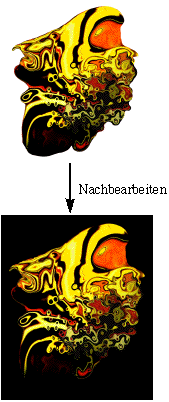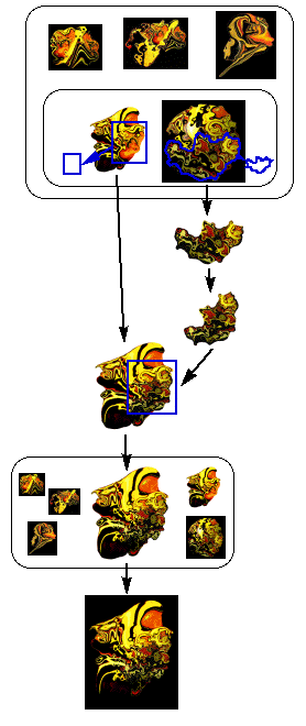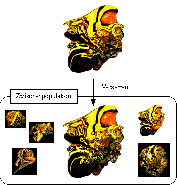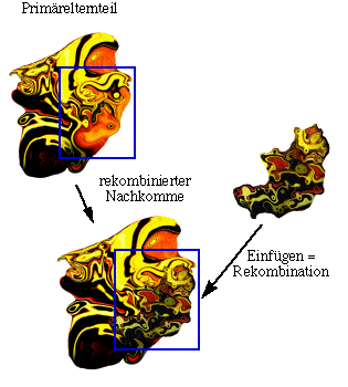 The sexual reproduction of metamorphoses images, which will be described from now on as bi-sexual recombination, uses a similar technique as the extended asexual reproduction with the part operations cutting off, rest-transformation distortion. The difference is, that these operations are carried out for one parent and that the result in inserted into the structure of the other parent. Here as well different sections of the operations can be applied. Further distortion operations should be applied after the recombination. |