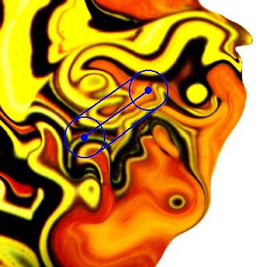 Verzerrungs-Operationen sind allgemein lokale Filter, welche die Anordnung von Bildteilen zueinander verändern, im Gegensatz zu einer RST-Transformation des Gesamtbildes, bei der die Beziehung der Bildteile zueinander konstant bleiben. Durch ihren lokalen Charakter werden sie festgelegt durch einen Anfangspunkt, einen Endpunkt und eine symmetrische Anwendungsbreite, die durch eine Distanz von der Verbindungskurve zwischen Anfangs- und Endpunkt definiert ist, die auch als Pinselbreite der Operation bezeichnet wird. Es soll gelten, daß die gerade Verbindungslinie zwischen den beiden Bildpunkten betrachtet wird, d.h. auf die Definition sonstiger Kurvenformen soll verzichtet werden. Die Anwendungsregion wird dadurch als Bildbereich definiert, der in Abbildung 1) innerhalb der blauen Begrenzungslinien liegt. Abbildung 1) Anwendungsregion einer Verzerrungs-Operation