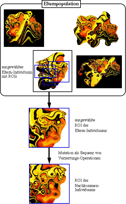 Nach der Auswahl eines Individuums zur ungeschlechtlichen Reproduktion wird aus der Menge der vorliegenden ROIs eine bestimmte Teilmenge ausgewählt, innerhalb derer Mutations-Operationen angewendet werden. Wird genau eine Art von Verzerrungs-Operation verwendet, so muß im nächsten Schritt spezifiziert werden, wie viele Operationen innerhalb der ausgewählten ROIs durchgeführt werden sollen. Diese beiden Operationen können auch gemeinsam festgelegt werden, indem ein Mutationsvektor s (k) des Bildes M-k auf der Basis der ROIs festgelegt wird, der für jede ROI (k,i) die Anzahl m (i) der Einzel-Mutations-Operatoren bestimmt, wobei m (i) = 0 bedeutet, daß in dieser ROI keine Mutations-Operationen durchgeführt werden: s (k) = ( (ROI (k,i), m (i)) | m (i) aus {0, 1, ...}, i = 1, ...). Die m (i) Verzerrungs-Operationen V (k,i,j) in der ROI (k,i) lassen sich als Liste darstellen, welche die Sequenz der Anwendung der Operationen kodiert, da die einzelnen Operationen nicht unabhängig voneinander auf die Original- ROI angewendet werden können, sondern Verzerrungen werden immer auf den jeweiligen Bildzustand angewendet. Auf diese Weise ergibt sich ein Mutationsvektor des Bildes M-k: s (k) = ( (ROI (k,i), V (k,i)) | i = 1, ...), V (k,i)) = (V (k,i,j) | j = 1, ..., m (i); m (i) aus {0, 1, ...}).