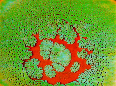 Die prinzipielle Eigenschaft dieses Systems ist somit die Dynamik der Gestaltbildung durch immanente physikalische Kräfte, was einer Selbstorganisation der entsprechenden Materialien entspricht. Ausgehend von einem Anfangszustand entwickelt sich ein solches dynamisches System selbständig bzw. durch Regelungsoperationen von Außen, indem eine Sequenz von Zwischenzuständen durchlaufen wird, bis ein Gleichgewichtszustand eintritt. Der Gleichgewichtszustand besitzt meist wenig interessante ästhetische Eigenschaften, sodaß die Zwischenzustände die Motive sind, die dem eigentlichen Interesse des Künstlers gelten. Ausnahmen sind beispielsweise bestimmte Systeme, die Oberflächenspannungen als Antrieb für den Selbstorganisationsprozeß benutzen, und bei denen ein Gleichgewichtszustand erreicht wird, der eine größere Komplexität als die der Zwischenzustände besitzt (siehe Abb. 1). |