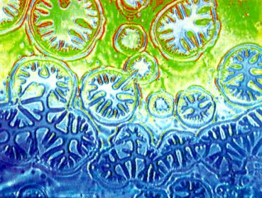 Ein Gestaltbildungsprozeß, den Volkhard Stürzbecher verwendet, ist die Musterbildung durch Oberflächenspannung. Treffen zwei oder mehrere Flüssigkeiten mit einer unterschiedlichen Oberflächenspannung aufeinander, so versuchen sie durch die Bildung von verzweigten Ausläufern (Finger) ein Gleichgewichtszustand zu erreichen (siehe Abb. 1). Abb. 1) Musterbildung durch Oberflächenspannung© 1996 by Spektrum der Wissenschaft |